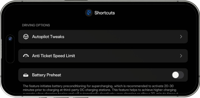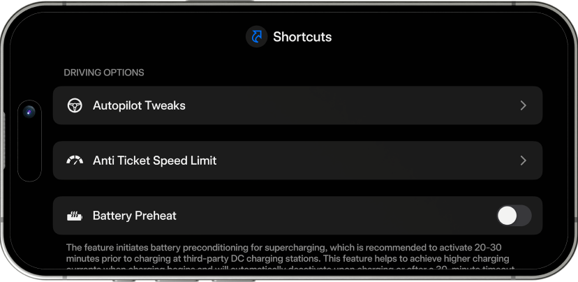 Preheat your car battery 10–20 minutes before Supercharging (not at a Tesla charging station) to save time. This accelerates charging by starting the preheating early, which deactivates automatically after 40 minutes.